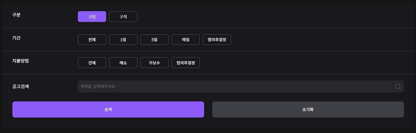 게임을 검색하거나 게임 탭에서 게임을 선택하면 게임 페이지로 이동해요. 게임 페이지에서는 부주를 의뢰하는 구인자와 부주를 지원하는 구직자들이 작성한 게시글의 제목, 플레이하는 서버, 원하는 보수 지불방법, 원하는 기간과 작성날짜에 대한 정보를 확인할 수 있어요. 원하는 게시글이 있어 클릭한다면 해당 글과 관련한 상세페이지로 연결되요.